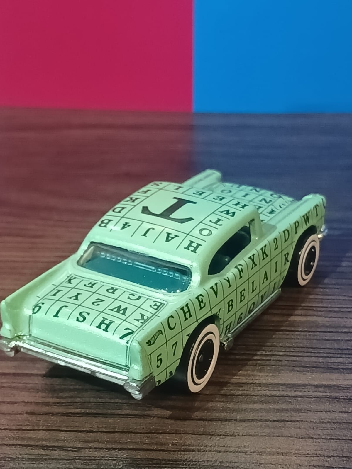 🔥 LEGENDARIO CHEVROLET 1957 EN UNA VERSIÓN ÚNICA DE LA SERIE “ART CARS”. PRESENTA UN DISEÑO ORIGINAL TIPO SOPA DE LETRAS EN TONO VERDE PASTEL, CON DETALLES CROMADOS EN LA PARRILLA Y LLANTAS CLÁSICAS DE BORDE BLANCO. UNA COMBINACIÓN PERFECTA ENTRE VINTAGE Y CREATIVIDAD QUE DESTACA ENTRE CUALQUIER COLECCIÓN.
