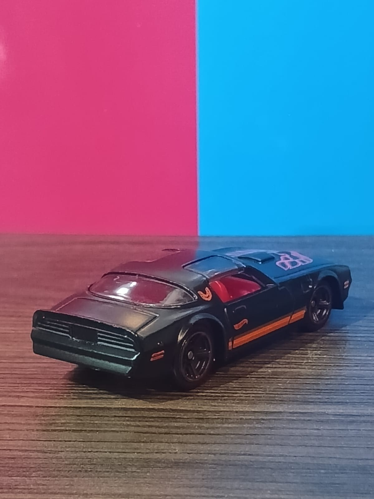 🔥 POTENTE Y CLÁSICO ’77 PONTIAC FIREBIRD TRANS AM EN COLOR NEGRO CON DETALLES EN NARANJA Y ROJO. ICÓNICO POR SU LLAMA EN EL CAPÓ Y SU ESTILO MUSCLE CAR AMERICANO. UN MODELO LLENO DE ACTITUD Y ESTILO RETRO, IDEAL PARA COLECCIONISTAS APASIONADOS POR LOS AUTOS DE LOS 70.