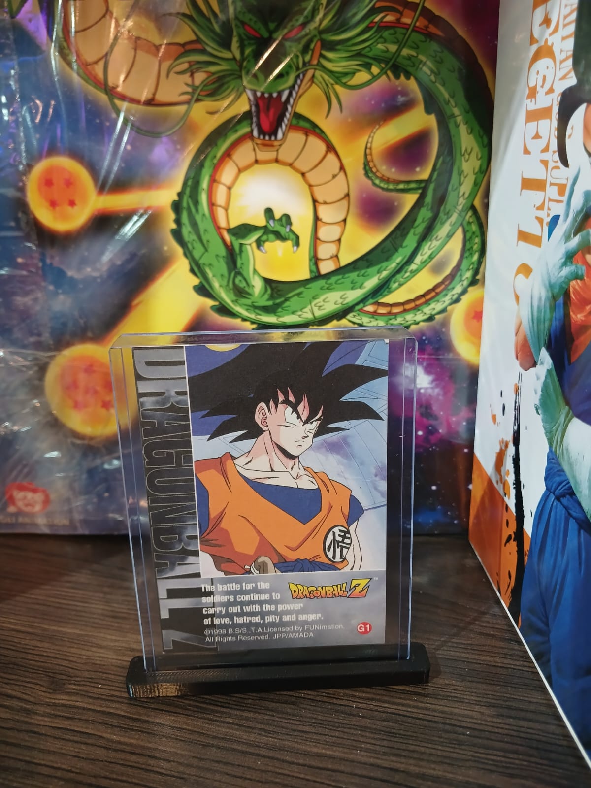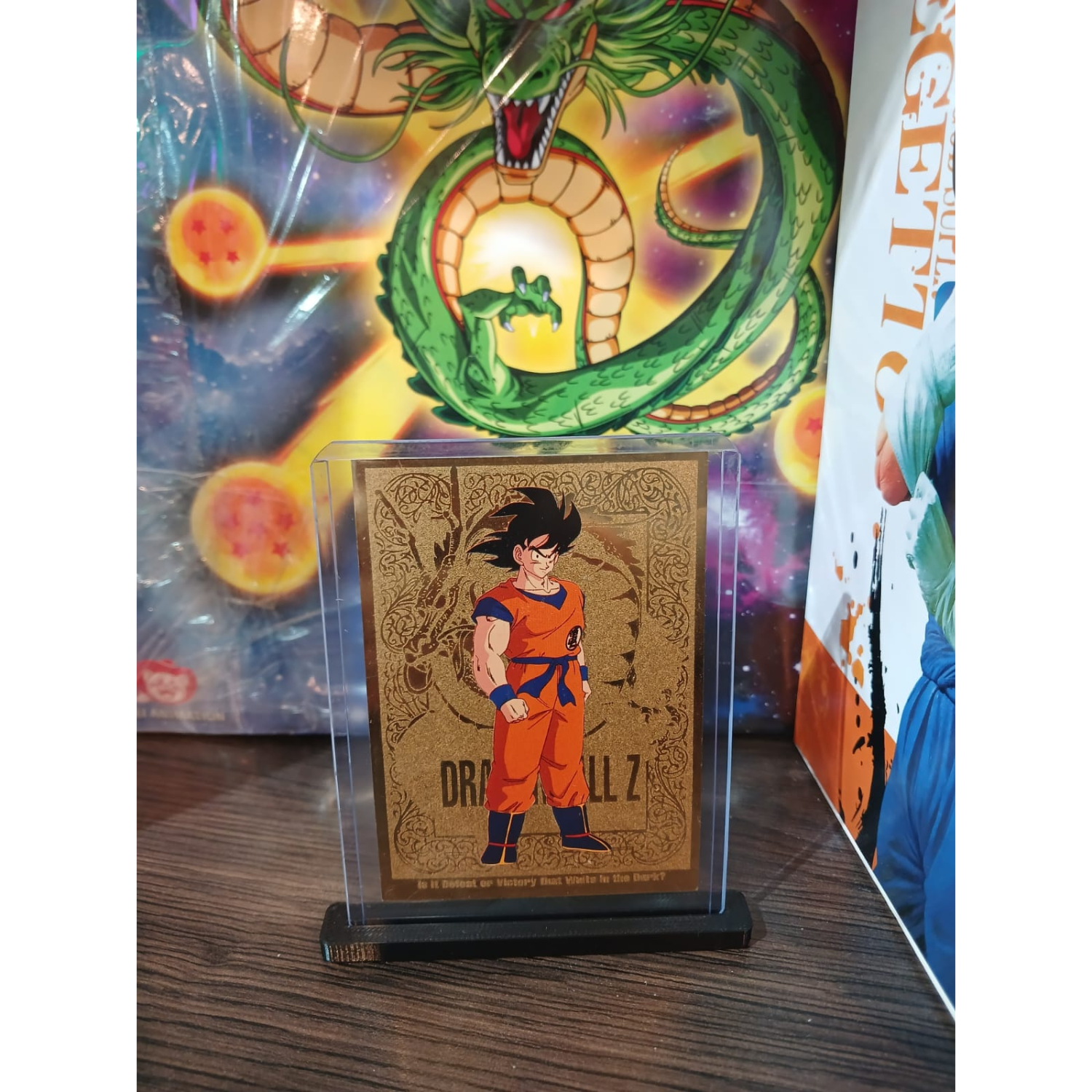 • Tarjeta coleccionable original de Dragon Ball Z con acabado dorado estilo 90s. Pieza vintage ideal para exhibición y coleccionistas.