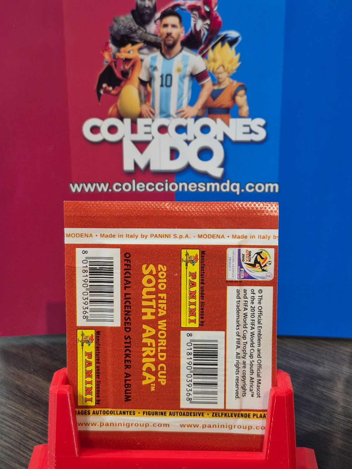 SOBRE ORIGINAL PANINI DEL MUNDIAL SUDÁFRICA 2010, UNA PIEZA CLÁSICA DE COLECCIÓN CON EL LOGO OFICIAL DE LA COPA DEL MUNDO. IMPERDIBLE PARA FANÁTICOS DEL FÚTBOL Y COLECCIONISTAS.