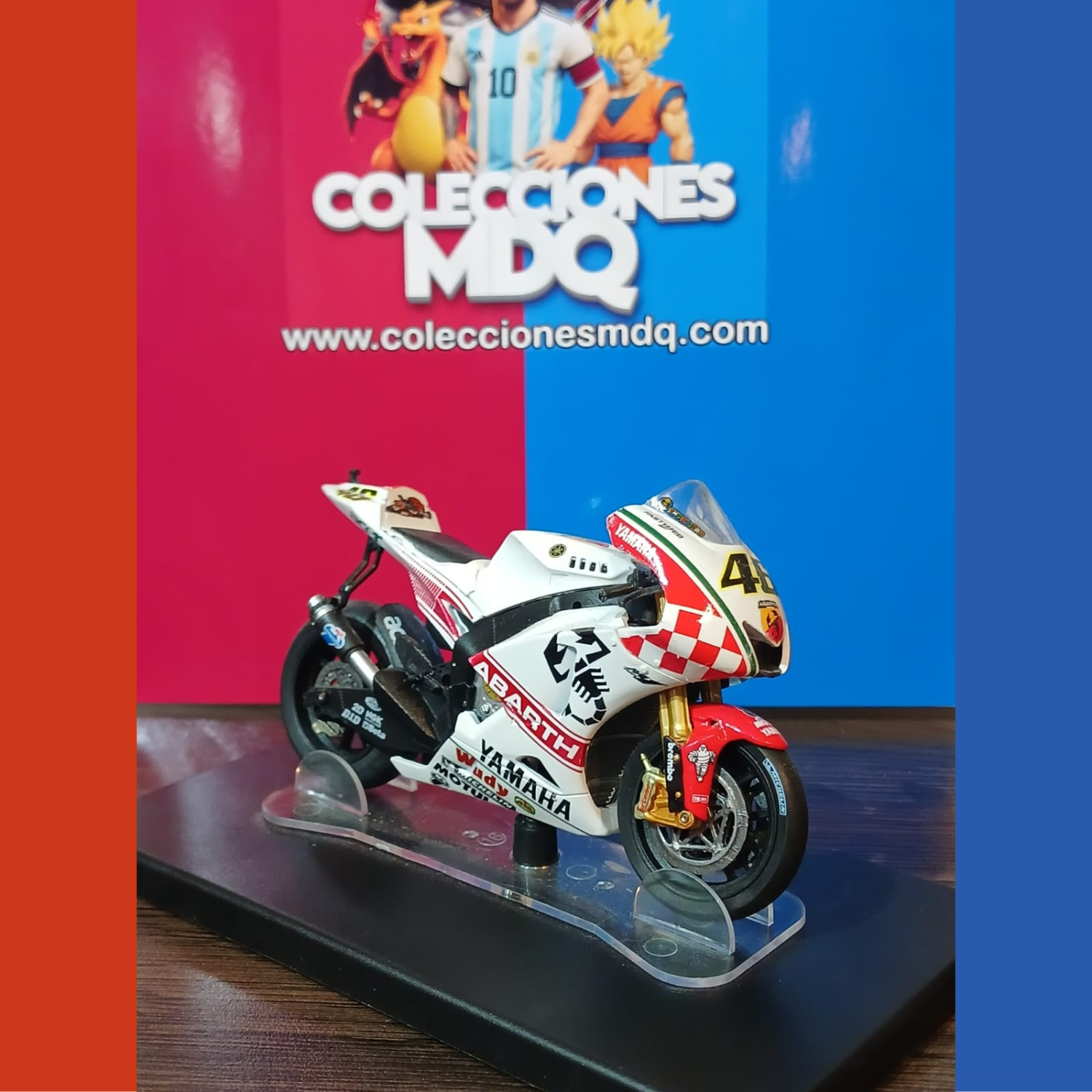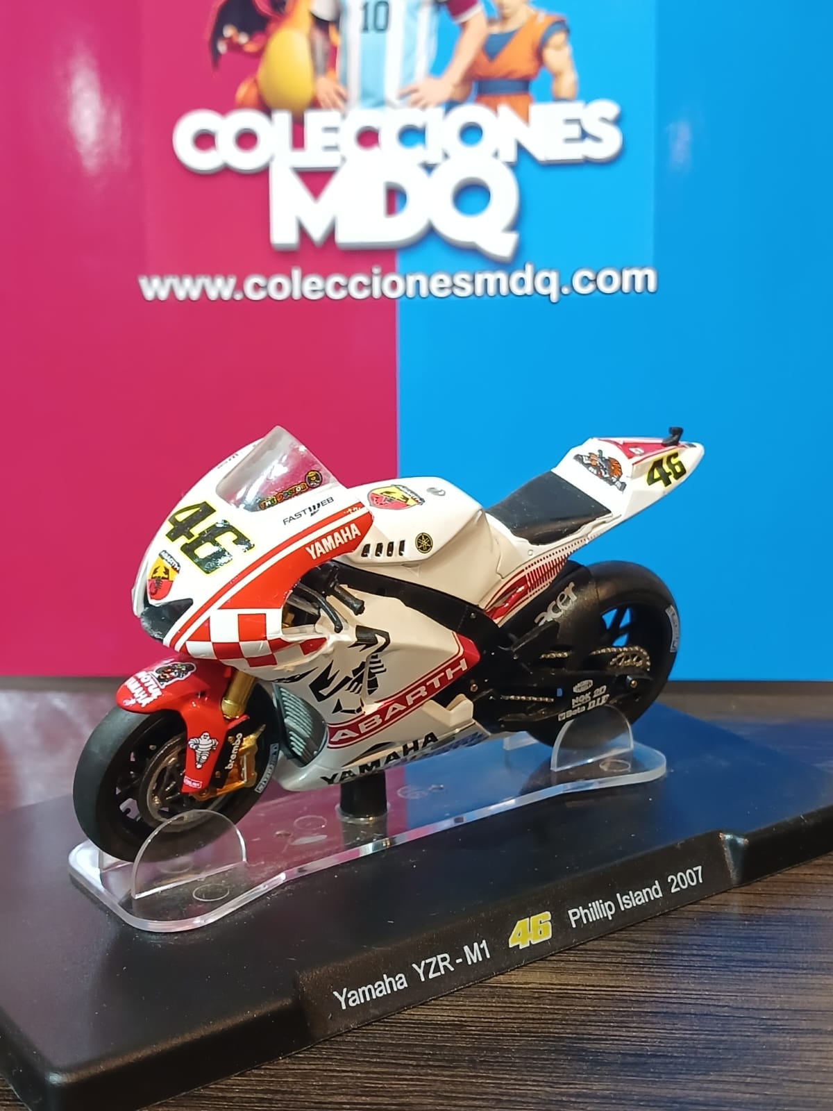 🔥 RÉPLICA DE LA LEGENDARIA YAMAHA YZR-M1 UTILIZADA POR VALENTINO ROSSI EN PHILLIP ISLAND 2007, CON SU ICÓNICO DISEÑO ABARTH. UN MODELO DE COLECCIÓN DETALLADO, IDEAL PARA FANÁTICOS DEL MOTOGP Y DEL “DOCTOR”. PRESENTA PINTURA DE ALTA CALIDAD, SOPORTE EXPOSITOR Y DECORACIONES FIELES A LA ORIGINAL.