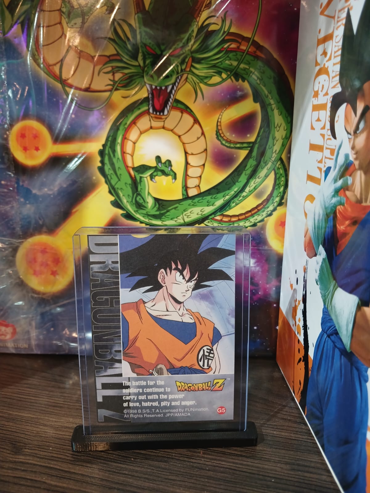 • Tarjeta coleccionable original de Dragon Ball Z con acabado dorado estilo 90s. Pieza vintage ideal para exhibición y coleccionistas.